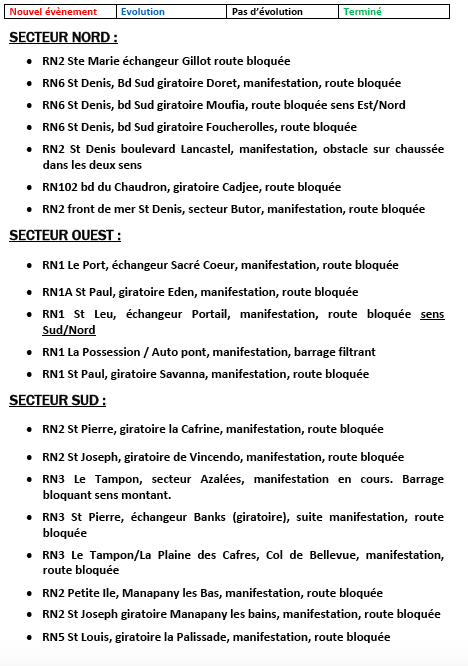 Une voiture calcinée se trouve sur la rue Léopold Rambaud en direction de l'est. Dans le même temps des personnes cagoulées ont prises d'assaut le magasin Jumbo Vauban et le Quick du Chaudron. Les forces de l'ordre sont sur place. Toujours à Saint-Denis le simply market vauban vandalisé par des personnes cagoulées. Du côté de Saint-Paul les magasins Sfr et orange St. Paul sont vadalisé. Vers la mairie annexe de cambuston un départ de feu est en cours.