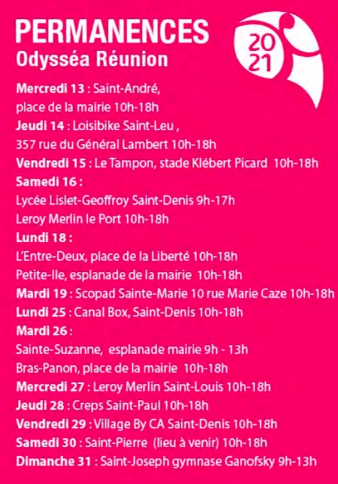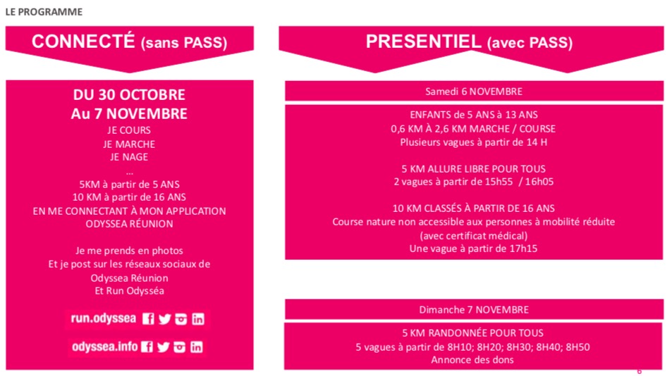 Pour la version connectée, les inscriptions sont ouvertes jusqu'au 24 octobre si vous souhaitez recevoir un t-shirt, ou jusqu'au 31 octobre sans t-shirt. "Pour l'heure, plus de 3.500 personnes sont déjà inscrites pour le challenge connecté" s'est réjoui Luc Bizouerne, directeur de Run Odysséa. "L'idée, c'était que tout le monde puisse participer : ceux qui ont un pass sanitaire, mais aussi ceux qui n'en ont pas. Ou tout simplement que des personnes n'étant pas à La Réunion puissent nous soutenir" indique-t-il. En 2020, des personnes avaient participé depuis une quinzaine de pays différents. Une application est désormais disponible pour les inscrits au challenge connecté, afin de pouvoir s'entraîner en ligne et enregistrer ses temps.