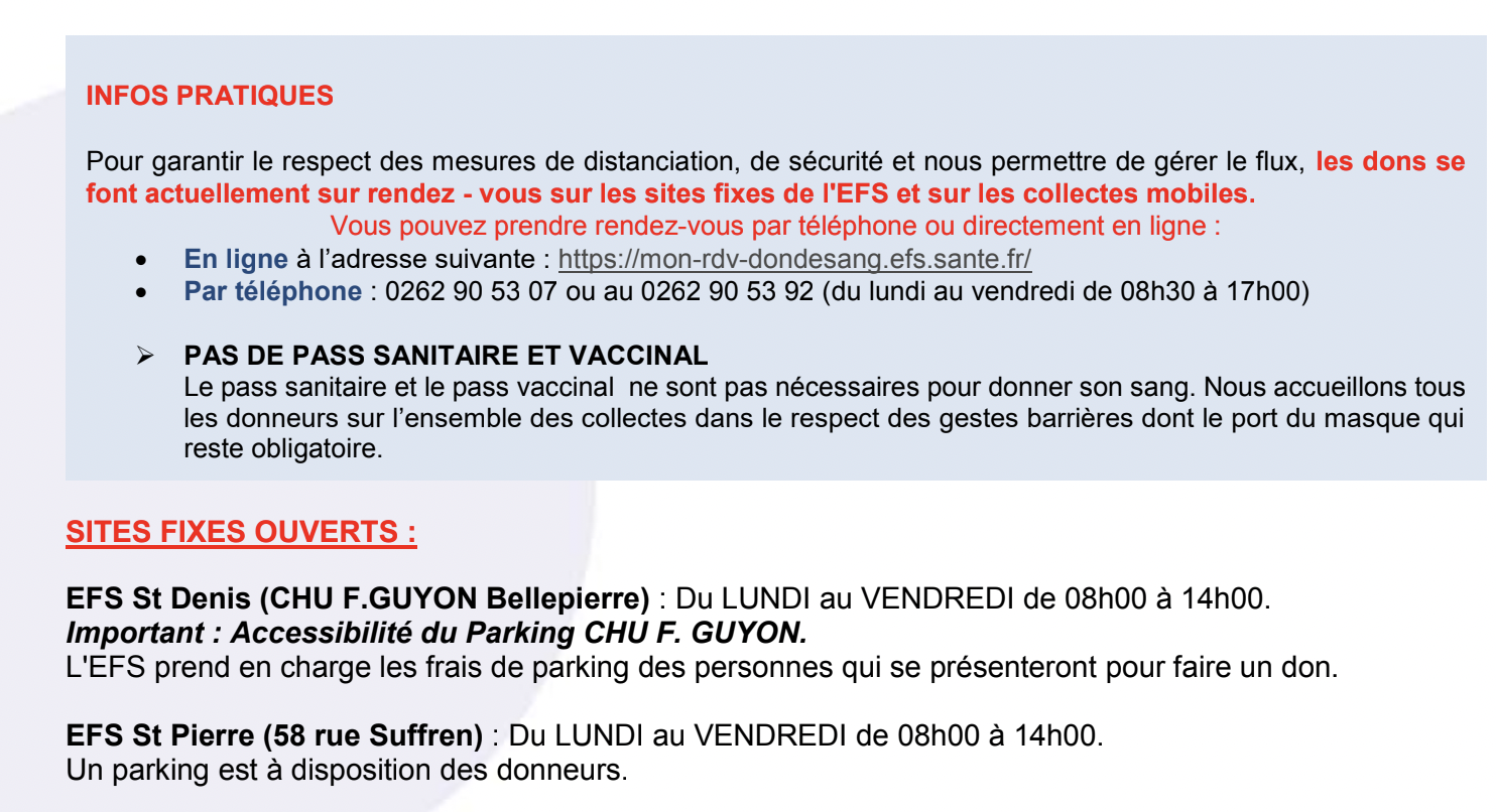 L'Etablissement Français du Sang La Réunion - Océan Indien vous informe des collectes mobiles de sang organisées du lundi 7 au samedi 12 mars 2022. Pour garantir le respect des mesures de distanciation, de sécurité et nous permettre de gérer le flux, les dons se font actuellement sur rendez - vous sur les sites fixes de l'EFS et sur les collectes mobiles. Les prises de rendez-vous se font en ligne sur le site de l'EFS ou par téléphone au 0262 90 53 07 ou au 0262 90 53 92. Le planning des collectes de sang est disponible ci-dessous. (Photo d'illustration : rb/www.ipreunion.com)