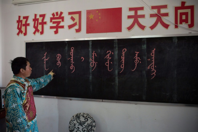 L'enseigne de l'école primaire de Sanjiazi, dans la province du Heilongjiang (nord-est) est en mandchou, et les couloirs de l'établissement sont tapissés d'affiches écrites verticalement dans cette langue par les élèves. Dans une salle de classe, des enfants attentifs égrènent en choeur les lettres de l'alphabet mandchou, puis les mots pour "parapluie" et "vache".