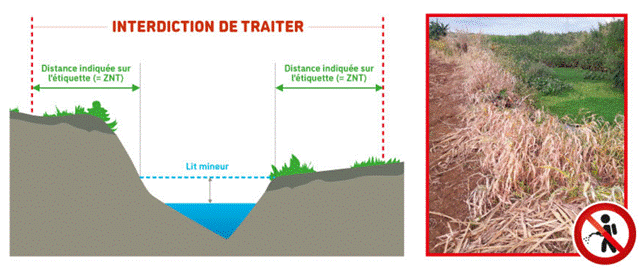 · sur les points d'eau : pas d'application directe de produit et respect d’une distance minimale indiquée sur l’arrêté préfectoral et rappelé sur l'étiquette du produit, s'appliquant de part et d'autre du point d'eau, même à sec (souvent 20 m pour les produits les plus utilisés à La Réunion).
