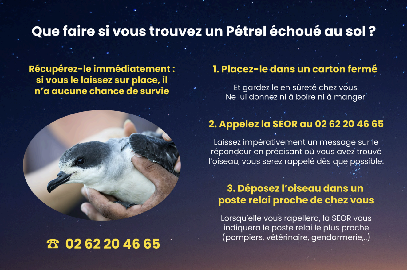Suivant la lumière naturelle de la lune et des étoiles, ces oiseaux marins sont souvent désorientés par la pollution lumineuse des villes, ce qui provoque de nombreux échouages au sol. Une fois à terre, les Pétrels sont incapables de redécoller seuls, ce qui compromet leur survie sans intervention humaine.