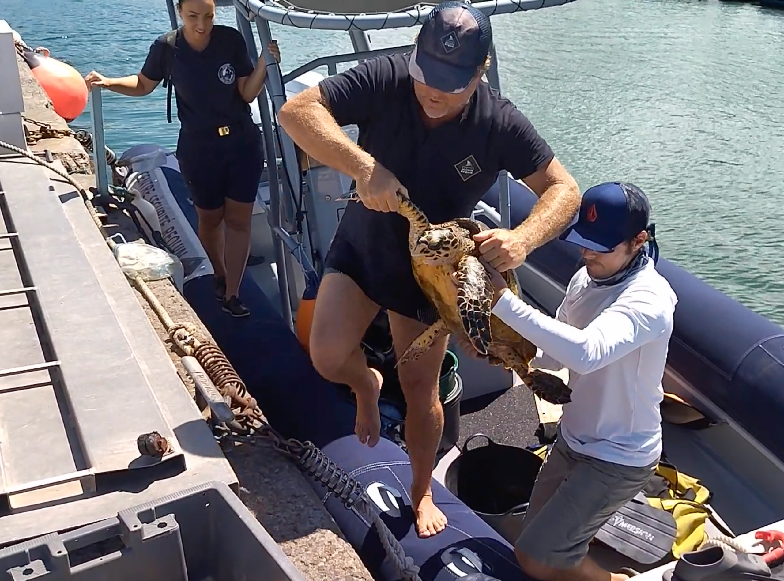 Le CSR est intervenu ce mardi matin 10 janvier 2023 pour récupérer une jeune tortue imbriquée de 20kg capturée accidentellement par un pêcheur depuis la jetée du port de St Gilles. Cette intervention a permis de récupérer la tortue qui a avalée l’hameçon et de prévenir le Centre de soins de Kelonia qui a pris la tortue en charge.
