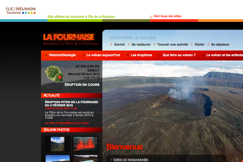 Alors que le Piton de la Fournaise est passé en phase d'alerte 1 ce mercredi 29 avril 2015, le site de l'IRT (Île de la Réunion Tourisme) annonce d'ores et déjà qu'une éruption est en cours sur son site dédié au volcan. (capture d'écran volcan.reunion.fr)