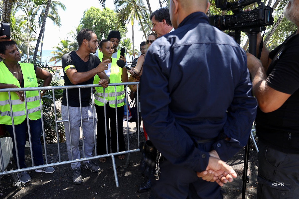 Les Gilets jaunes présents devant la préfecture échangent avec certains des maires conviés à la recontre avec Annick Girardin. "Dites lui que nous ne voulonspas d'un bouclier qualité prix, mais d'une baisse de sprix généralisée" demandent-ils à Daniel Gonhtier, maire de Bras Panon