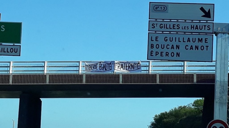Les convoies se dirigeant vers Le Port ne devraient pas tarder à se mettre en route. Des banderoles sont déjà visibles, comme le partage un internaute avec nous, regardez :