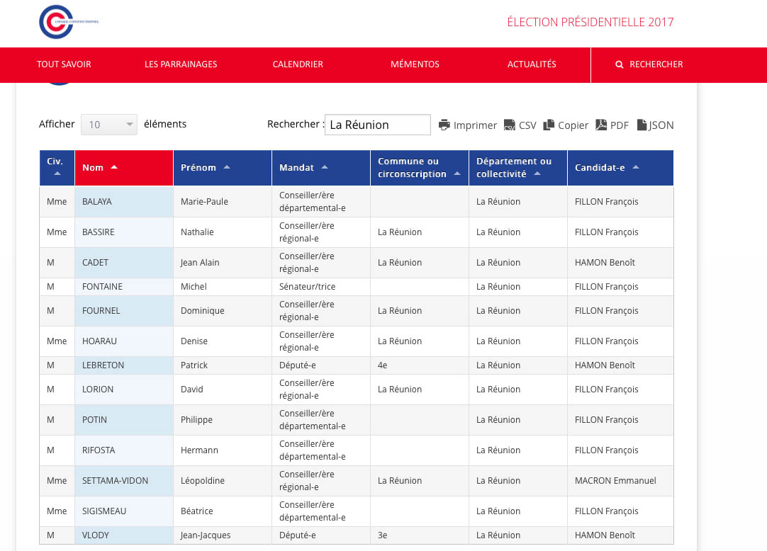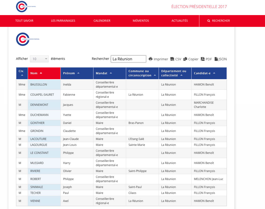 Liste des élus de La Réunion dont les parrainages ont été validés par le conseil constitiutionnel le vendredi 9 mars 2017