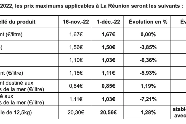 En décembre 2022, les prix maximums applicables à La Réunion seront les suivants :