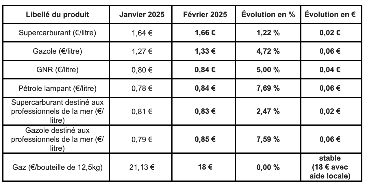 Coup dur pour le portefeuille des usagers de la route. Dès ce samedi 1er février 2025 le litre de gazole augmente de 6 centimes et passe à 1,33 euros. Le sans plomb sera facturé 1,66 le litre soit une hausse de 2 centimes. "En raison du contexte géopolitique mondial, cette augmentation des cours est inéluctable" affirme la préfecture. Grace à l'aide de la Région, le prix de la bouteille de gaz reste stable à 18 euros (Photo : www.imazpress.com)