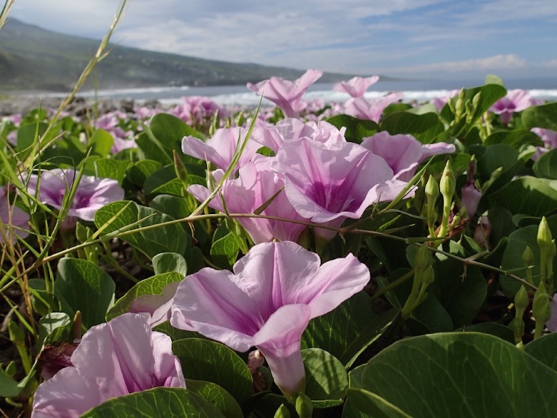 Les patates à Duran sont actuellement en fleurs : le directeur de Kélonia, Stéphane Ciccione, invite à faire preuve de prudence afin d'éviter de les piétiner. Ces plantes limitent l'érosion côtière et front partie de la palette végétale définie pour les programme de restauration des plages de ponte. Attention à ne pas les écraser !