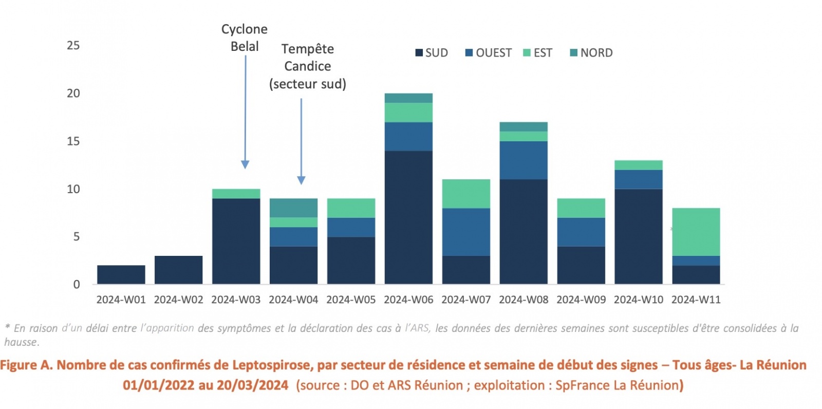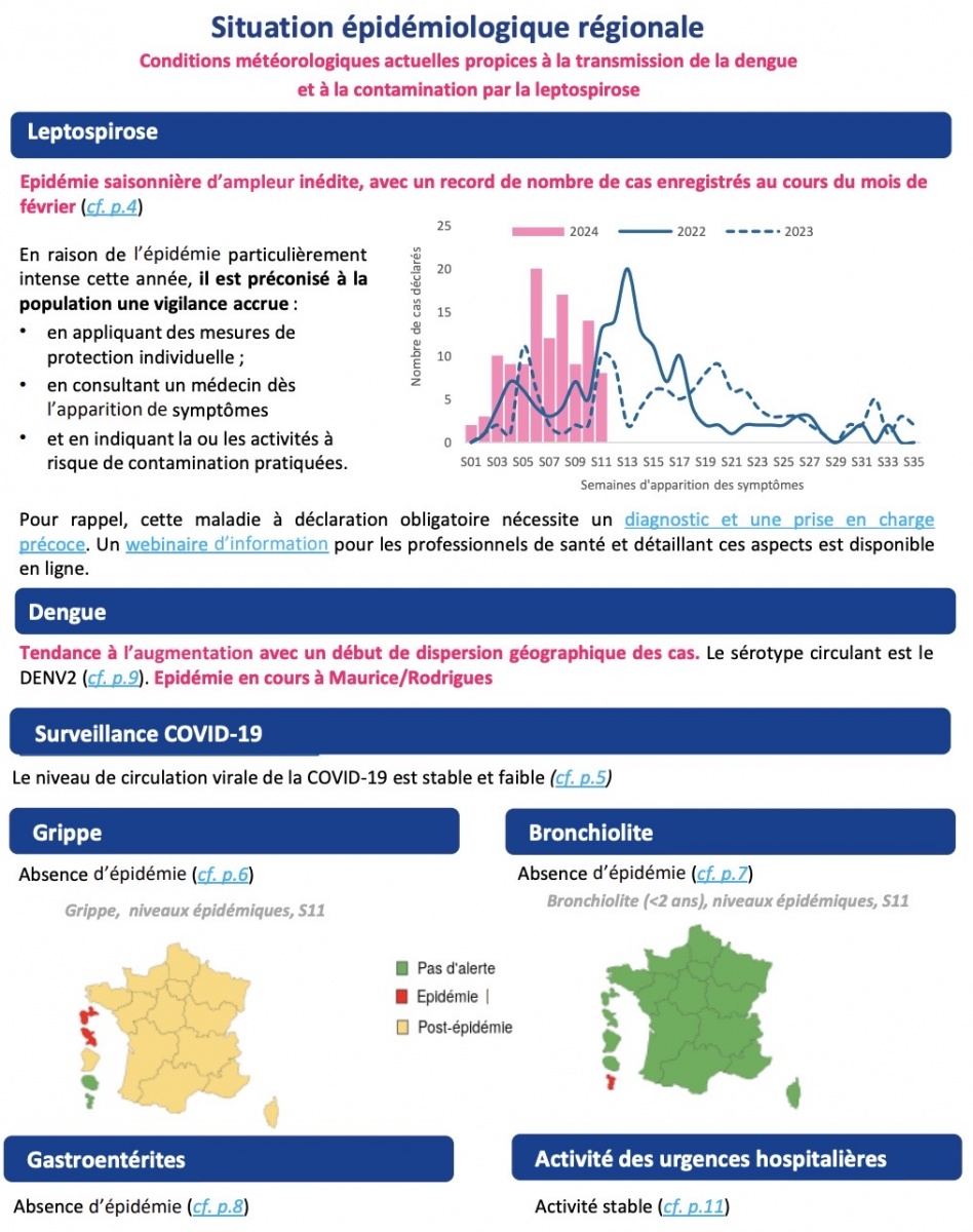 Il n’a pas été identifié de nouveaux décès au cours la S11 (1 en lien direct en S10 et 1 en cours d'investigation pour l’imputabilité en S09). Pour rappel, à La Réunion en moyenne de 1 à 3 décès par an sont liés à la leptospirose. Données du réseau Oscour®: En S11, l’activité pour suspicion de leptospirose (14 passages et 9 hospitalisations) représentait 0,3% de l’activité toutes causes confondues. Depuis le début de l’année, avec 73 passages et 43 hospitalisations, l’activité des services d’urgences pour ce motif était deux fois supérieure à la même période de 2023 (35 passages et 11 hospitalisations) et 2022 (36 passages et 22 hospitalisations)