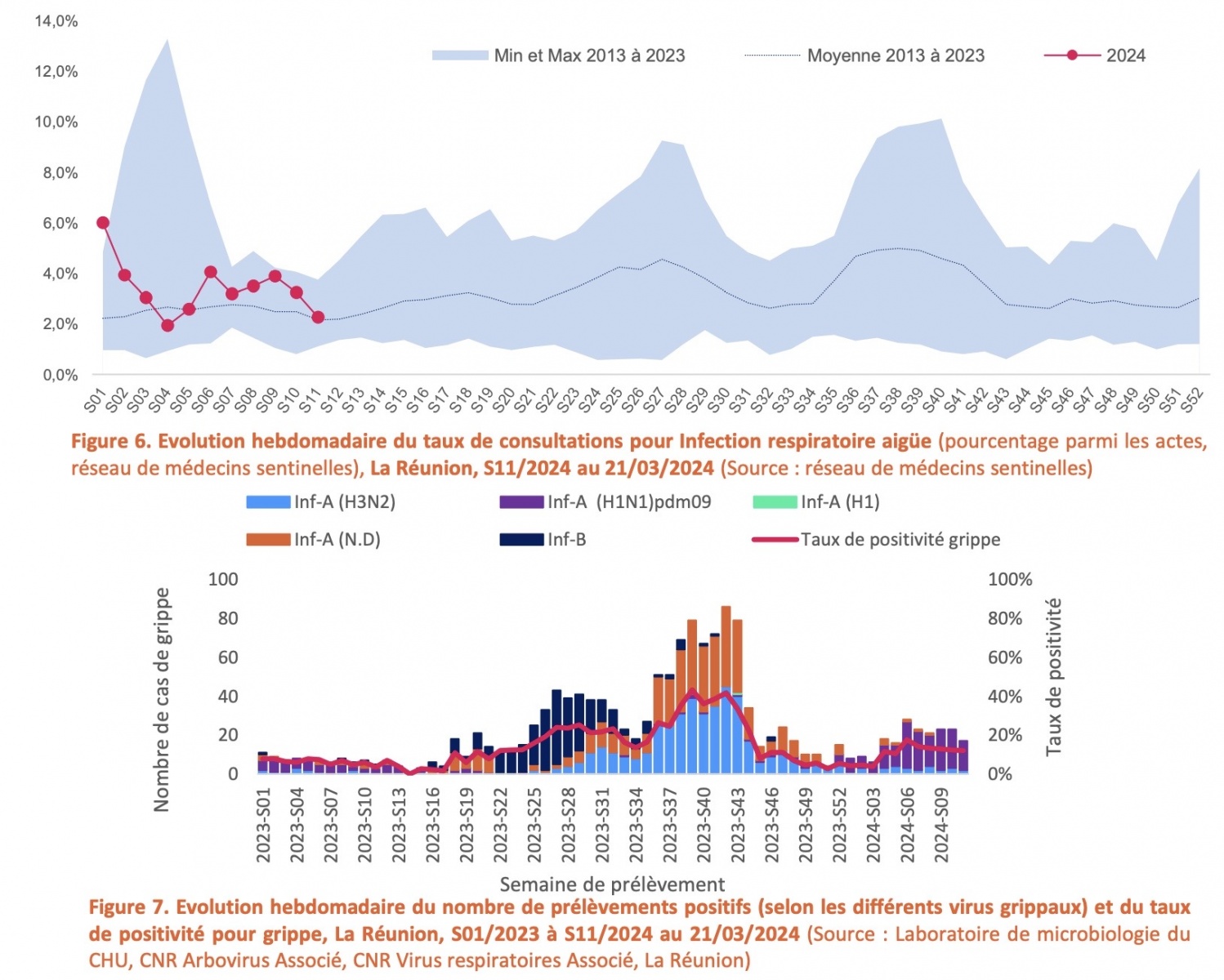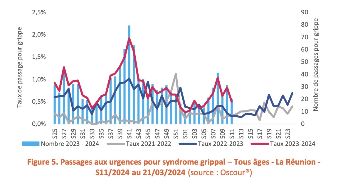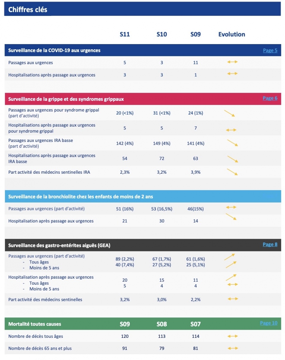 En S11, les passages aux urgences pour motif de syndrome grippal étaient en baisse. Les urgences ont enregistré 20 passages pour un motif de syndrome grippal en S11 contre 31 la semaine précédente, soit une baisse de 30% (Figure 5). Le nombre d’hospitalisations pour syndrome grippal était stable avec 5 hospitalisations rapportées en S10 et S11. La part d’activité des urgences pour un motif de grippe représentait moins de 1% de l’activité totale.