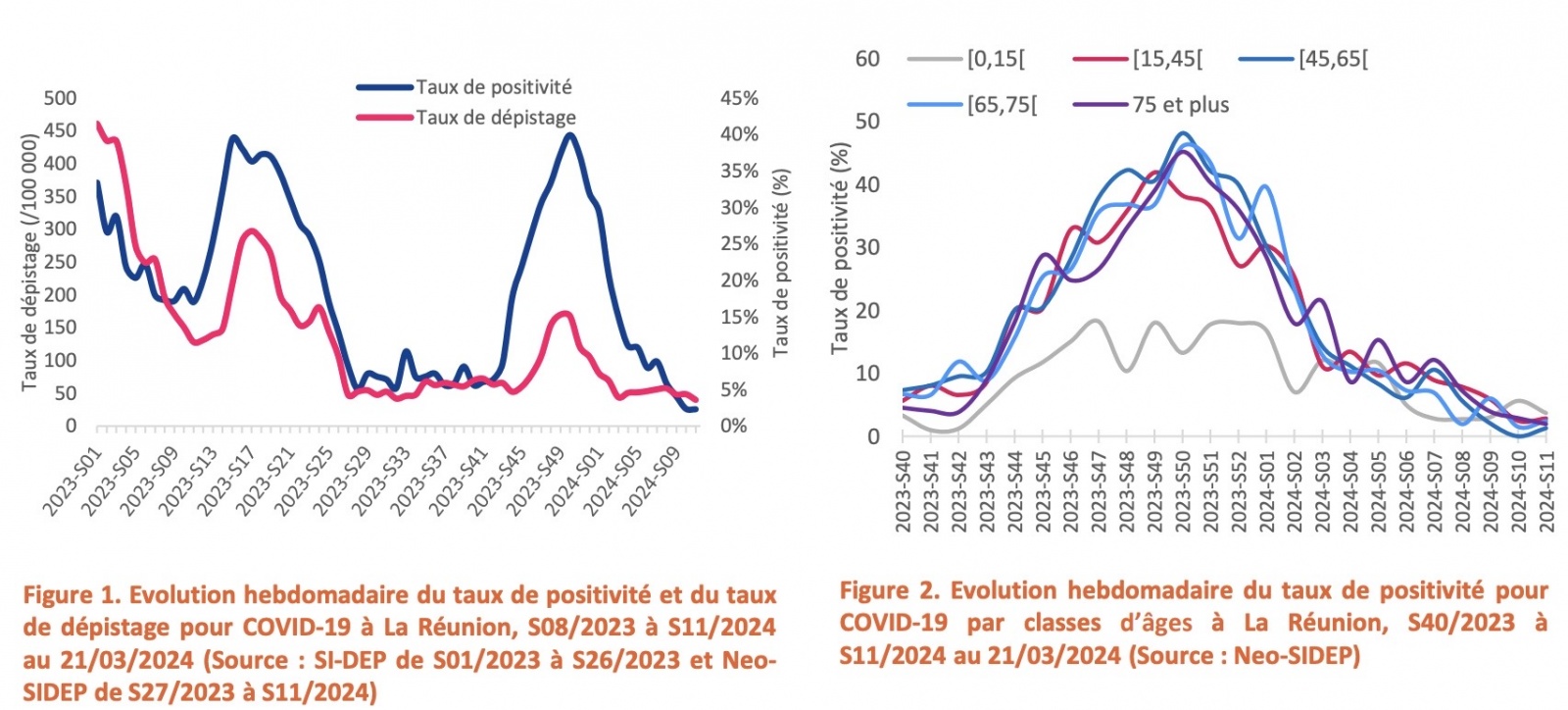 Le niveau de circulation virale de la COVID-19 est stable et faible. En S11, le taux de positivité (TP) était stable : 2% en S11 comme en S10 (Figure 1). Le taux de dépistage était en diminution : 39 tests pour 100 000 habitants en S11 contre 49 tests pour 100 000 habitants en S10. Le TP était stable à 2% en S11 et S10. L’analyse du taux de positivité par classes d’âges fait état d’une stabilité dans chacune d’entre elle (Figure 2)
