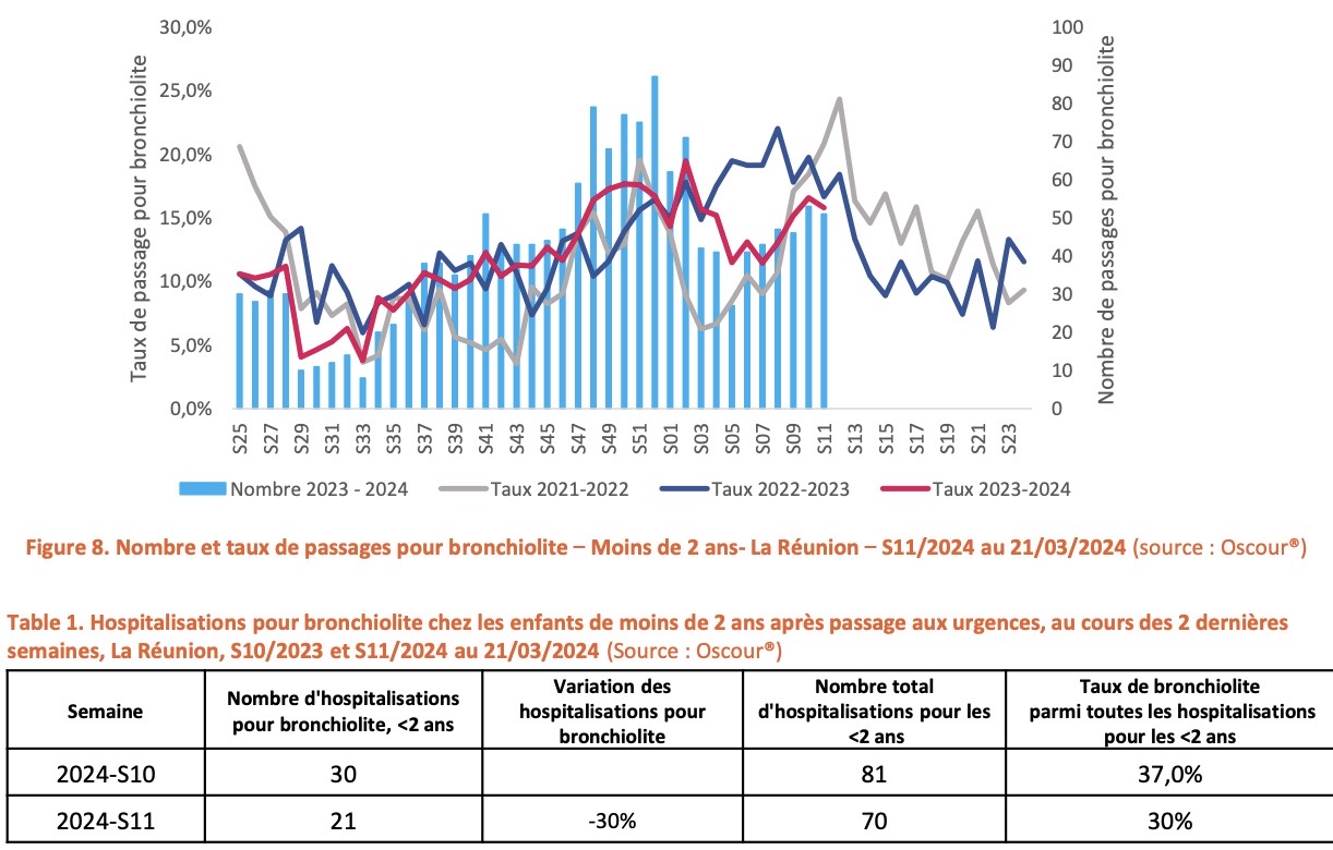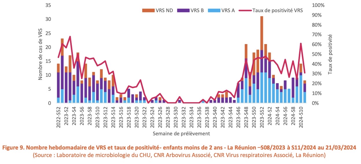 Concernant la surveillance virologique, le taux de positivité pour le VRS chez les moins de deux ans baissait fortement, et se situait à 31% en S11 vs 61% en S10 avec une co-circulation de VRS de type A et de VRS de type B.