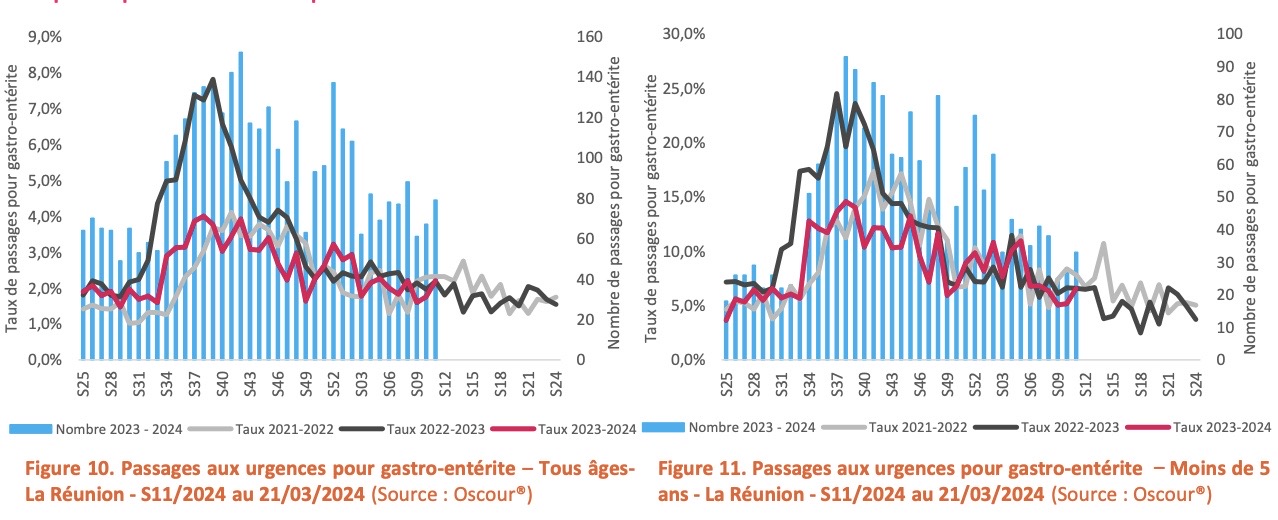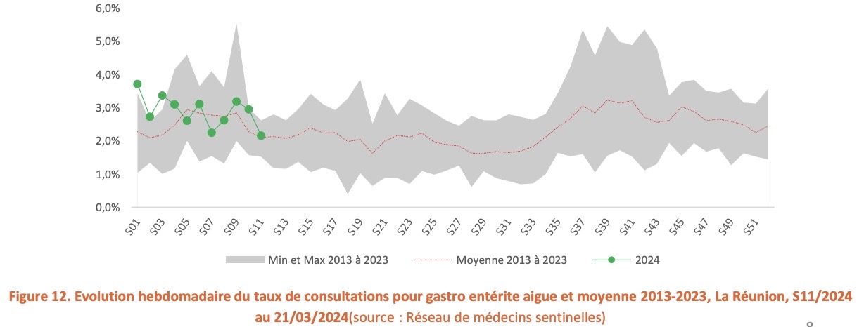 En S11, la part de l’activité des urgences chez les moins de 5 ans pour la gastro-entérite progressait par rapport à la semaine précédente (6,7% en S11 vs 5,1% en S10). Malgré des indicateurs sanitaires hospitaliers en hausse La Réunion n’est pas en phase épidémique en raison d’un impact sanitaire restreint à ce stade.