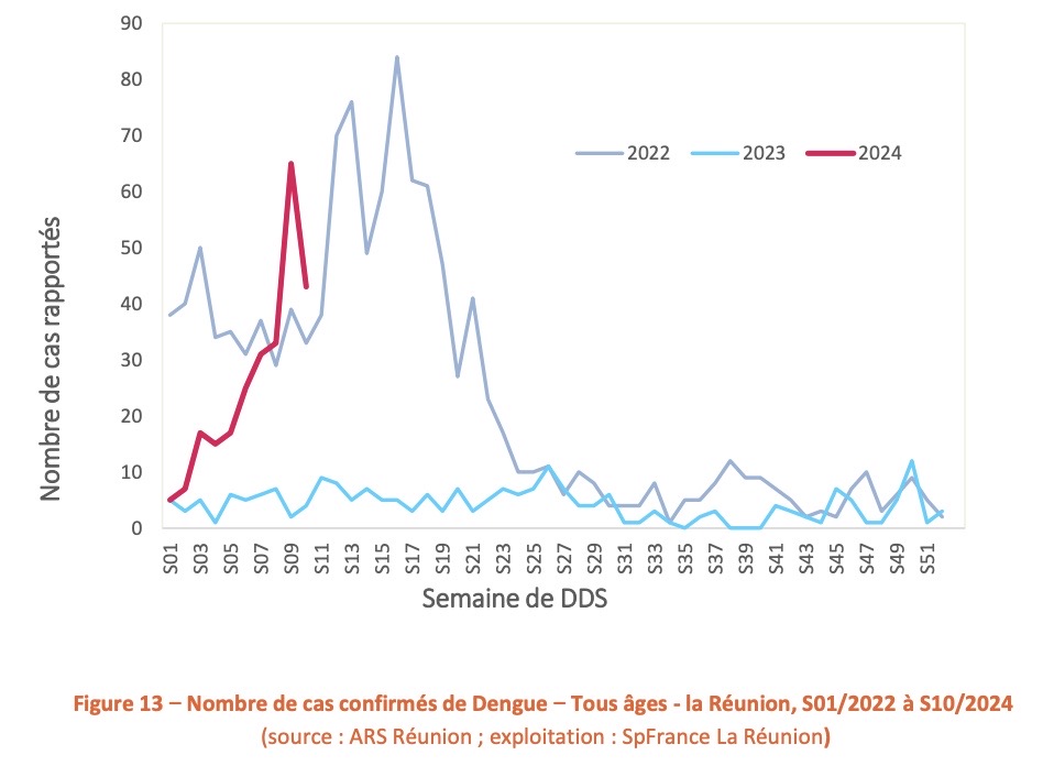 Ce nombre de cas déclarés en 2024 est particulièrement élevé si on le compare aux deux dernières années (correspondantes aux incidences maximales enregistrées à La Réunion). Ainsi pour la même période de 2023, 29 cas avaient été déclarés pour 164 cas annuels et pour 2022, 44 cas déclarés pour 169 cas an.