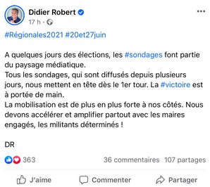 Si tel est le cas, nous condamnons bien sûr avec véhémence ce piratage qui n'honore pas leurs auteurs et assurons évidemment Didier Robert et son équipe de notre total soutien dans cette épreuve. Bien heureusement tout le monde semble s'être rendu compte de la supercherie à l'heure où nous écrivons ces lignes : le sondage a disparu des pages militantes, et le compte Facebook à l'origine du post a été supprimé. Toutes ces suppressions sont d'ailleurs intervenues après que l'origine de la manipulation a été tracée. L'équipe Robert doit sûrement être soulagée.