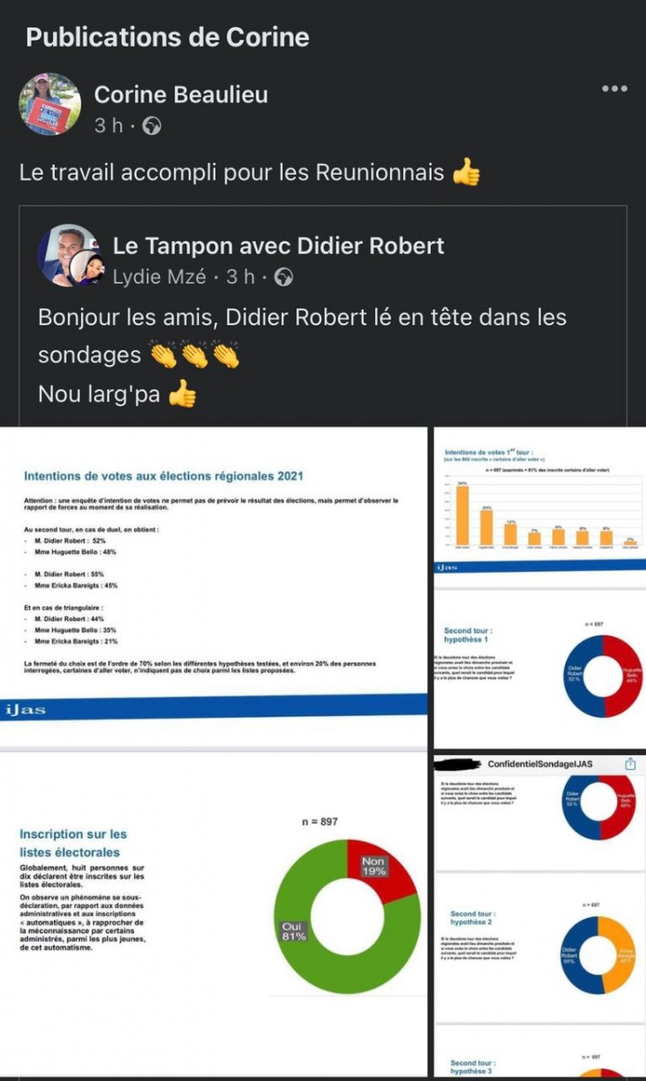 C'est un sondage bien étrange (et au final pathétique) qui circule sur les réseaux sociaux depuis ce lundi 7 juin 2021. Alors que Réunion la 1ère, Imaz Press et le JIR se préparaient à publier un sondage de l'institut Sagis sur les intentions de vote pour le premier tour des régionales 2021, un autre institut inconnu au bataillon a été partagé en masse par le clan Robert. Sans surprise, celui-ci propulsait le président sortant en haut des intentions de vote, le créditant à 34%, bien loin devant ses opposant.e.s. Dommage que ce sondage soit bidon, pour reprendre les mots de Philippe Fabing, directeur de Sagis. Chose dont le clan Robert a dû se rendre compte, les nombreux posts ayant été supprimés dans la matinée. Une rapide investigation a en effet permis de tracer l'origine de ce subterfuge