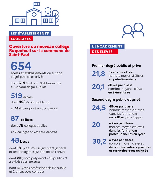 654 établissements rouvrent leurs portes pour accueilir 220.220 élèves. Le nouveau collège Roquefeuil à Saint-Paul fait sa première rentrée scolaire. Parmi les établissements on compte 519 écoles dont 493 publiques, 87 collèges et 48 lycées.