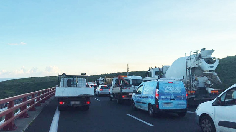 Circulation très difficile ce mardi 30 mars au matin : le CRGT compte 8 km de bouchons sur la Route des Tamarins en direction du nord, de l'Hermitage jusqu'à Cambaie environ. L'embouteillage, de 11 km ce matin, commence donc à se résorber mais très lentement; Les travaux effectués sur le pont de la Rivière des Galets ont pris du retard, et cette portion de route a donc rouvert plus tard que prévu, vers 6h15 au lieu de 5h. (Photo : Jeff Lebian / Radar 974)