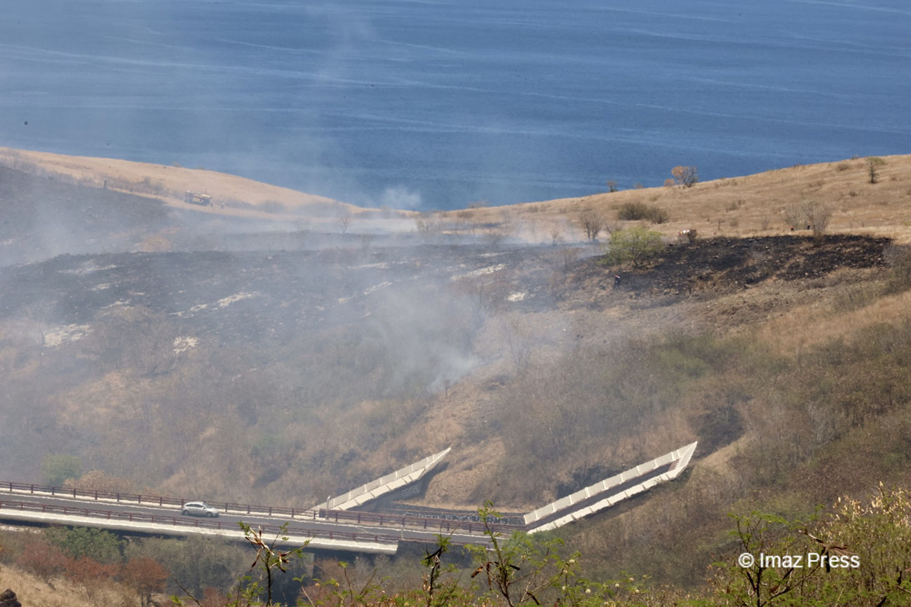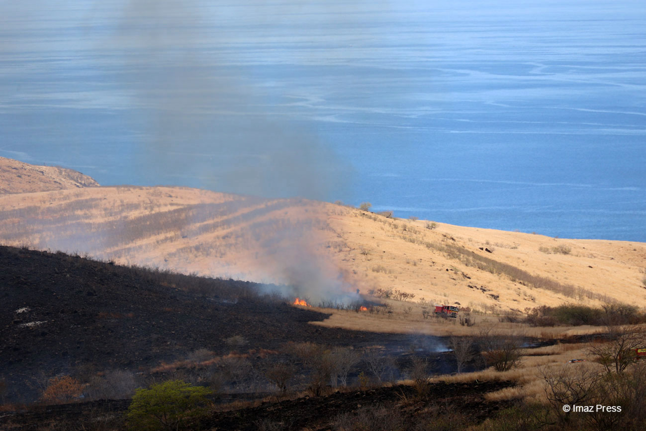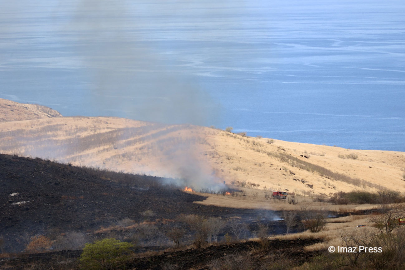 L'incendie se poursuit dans la savane du Cap Lahoussaye à Saint-Paul. Des flammes et de la fumée restent encore bien visible.