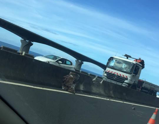 Deux heures après la chute d'un bloc rocheux de 500 kg sur la voies de la route du littoral au niveau du radar, les bouchons sont résorbés dans les deux sens de circulation. Les restes de roches ont été dégagés . À noter, un petit ralentissement dans le sens Ouest-Nord au niveau de l'endroit de l'impact certainement provoqué par des automobilistes curieux qui freinent pour regarder.