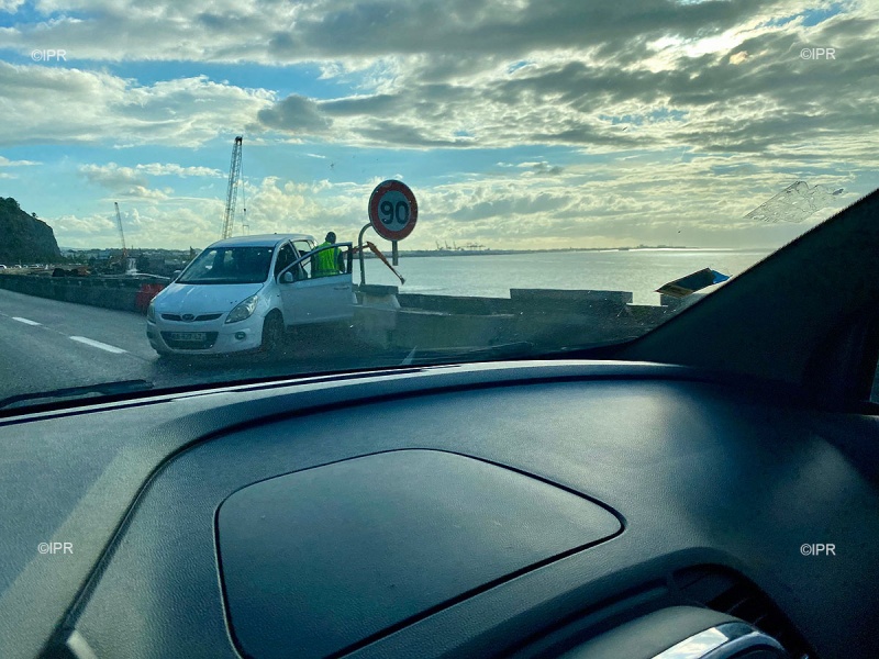 Ce vendredi soir 5 février 2021, un conducteur a fini sa course sur la rambarde côté mer de la Route du littoral, au niveau de la Ravine à Malheur, en direction de l'ouest. 1,5 km d'embouteillage se font formés mais ont rapidement été résorbés. Le véhicule a été enlevé (Photo rb/www.ipreunion.com)