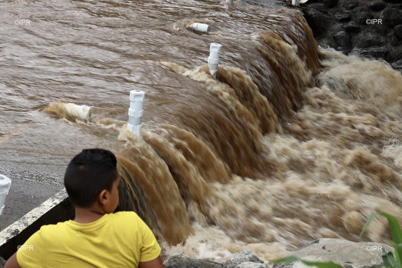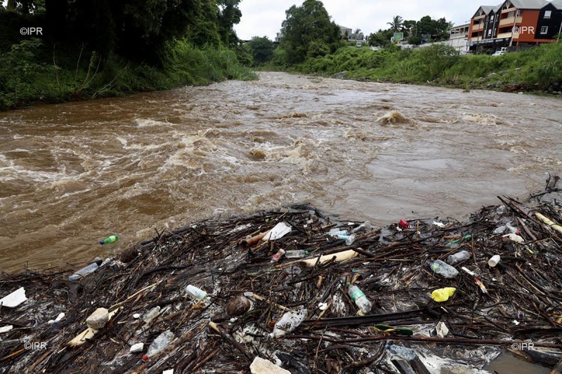 À Saint-Louis, le radier des trois ravines qui se jette dans l'Étang du Gol est gonflé par les eaux des pluies qui se sont abatuues ces dernières heures, des détritus flottent à la surface pendant que des torrents d'eau poursuivent leur course, regardez :