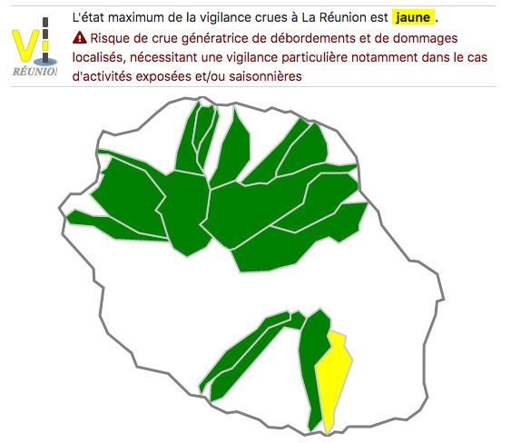 Ce mercredi 22 janvier 2020, la pluie continue de s'abattre sur le sud de l'île. Météo France a donc placé le sud de l'île sous vigilance fortes pluies à 10 heures, puis la levé à 13h30. "Des pluies intermittentes persistent mais ne justifient plus le maintien de la vigilance fortes pluies" précise le bulletin. Mais dans le sud, avec les épisodes pluvieux successifs, les sols sont gorgés d'eau, les radiers sont submergés et plusieurs chemins inondés notamment à l'Étang-Salé et à Saint-Louis. Nous sommes en live, suivez nous (Photo d'illustration rb/www.ipreunion.com)