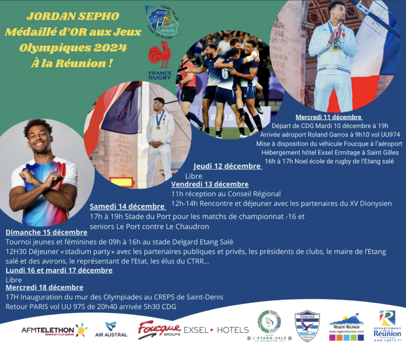 Du 11 au 18 décembre 2024, Jordan Sepho, membre de l'équipe de France de rugby à 7 sera de retour sur son île. Le Réunionnais a été couronné d'or lors des Jeux olympiques de Paris 2024. Au programme de sa venue, rencontre avec les joueurs du XV Dionysien, présence au Port pour les matchs de championnat. Il viendra également encourager les jeunes et féminines au stade Delgard de l'Étang-Salé.