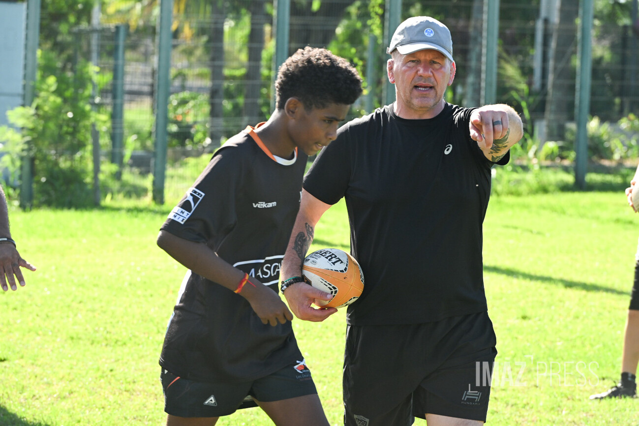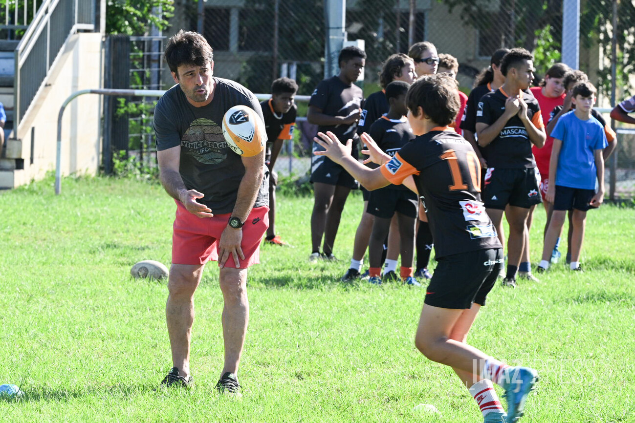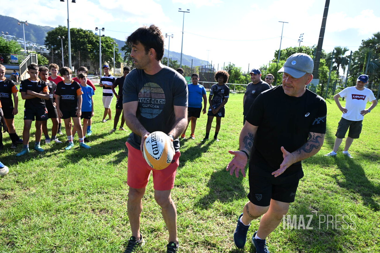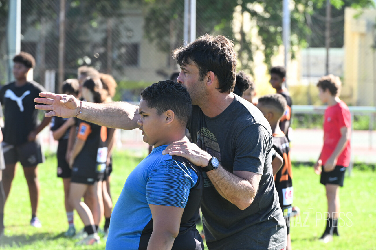 Ce mercredi 14 mai 2025, deux anciens internationaux français, Christian Califano et Xavier Garbajosa, ont dirigé un entraînement aux côtés de jeunes joueurs des clubs du nord de La Réunion. Une séance placée sous le signe de la transmission, qui s’inscrit dans une dynamique de développement du rugby sur l’île. (Photos : Emmanuel Grondin www.imazpress.com)