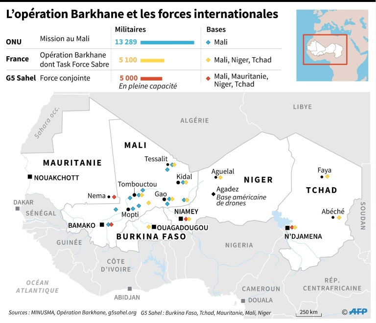 La force Barkhane, qui s'étend sur cinq pays du Sahel, a été étoffée de 600 soldats, ce qui a porté son effectif total à 5.100 en 2020. Elle a revendiqué la "neutralisation" de dizaines de jihadistes ces dernières semaines, au côté de la force du G5 Sahel.