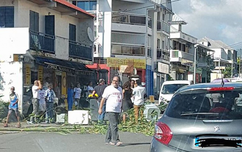 Ce vendredi 21 avril 2017, plusieurs personnes se sont réunies près de la compagnie des eaux de la Cise à Saint-André. Ils revendiquent une meilleure qualité de l'eau : à 10 heures ce matin, la route était barrée devant les locaux. (Photo : Radar 974/Lorenza Perianin)
