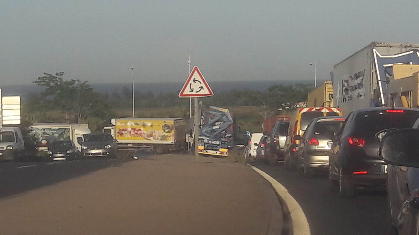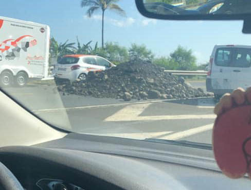 Le barrage de Cambaie (Saint-Paul) : il a été levé par les forces de l'ordre mais le chargement de gravier qui avait été déversé sur la chaussée est toujours sur les lieu, la circulation est très difficile. l'embouteillage s'étend de l'Éperon à Savannah, 10km de bouchon.