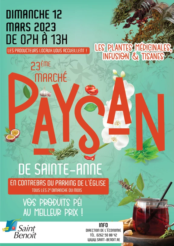 Le 23ème marché paysan de Sainte-Anne est organisé le dimanche 12 mars 2023 de 7h à 13h en contrebas du parking de l'église. Cette édition mettra à l'honneur les plantes médicinales, infusions et tisanes avec l'aide de l'association Aplamedom. Des produits péi seront également à la vente et des animations seront organisées. Nous publions le programme de l'évènement ci-dessous. (photo d'illustration RB/www.imazpress.com)