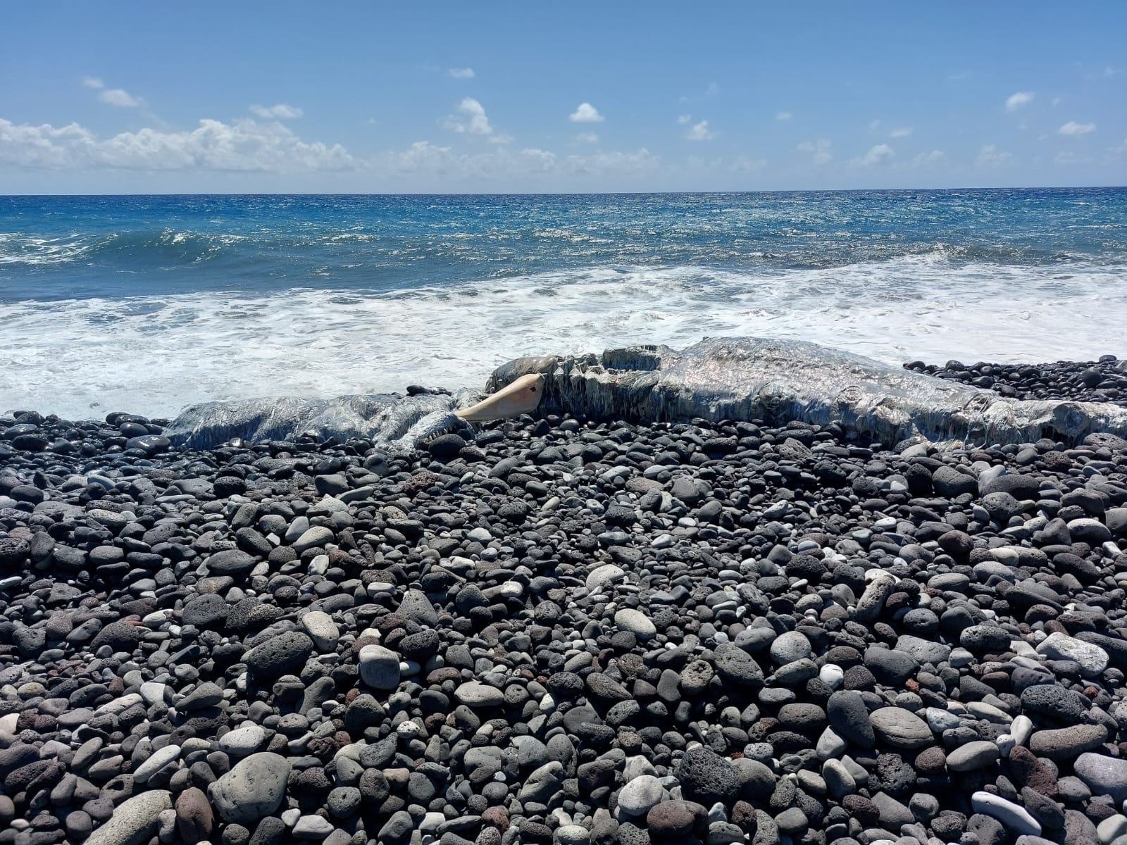 La carcasse du cachalot qui dérivait au large de Sainte-Rose hier s'est échoué ce jeudi 13 octobre 2022 près du Bassin Bleu à Saint-Anne, sur la commune de Saint-Benoît. Globice va effectuer des prélèvements d'échantillons pour des analyses et essayer d'identifier les causes de la mort. Mais dans cet état, "cela reste délicat", précise Jean-Marc Gancille de Globice. (Photo : Globice)