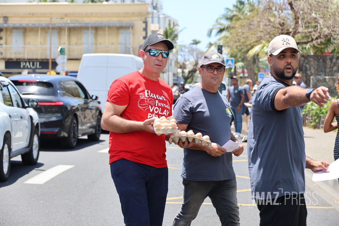 La société Couvée d'or, qui produit des poussins destinés à la consommation, a organisé ce mercredi 9 octobre 2024 une action pour dénoncer l'importation d’œufs depuis l'Hexagone par son concurrent. 8.000 œufs, qui étaient destinés à être couvés et qui ont finalement été déclassés en raison d'une surproduction, ont été distribués aux automobilistes circulant devant la préfecture de Saint-Denis, pour alerter la population sur la situation dans laquelle se trouve l'entreprise. (Photo photo sly/www.imazpress.com)