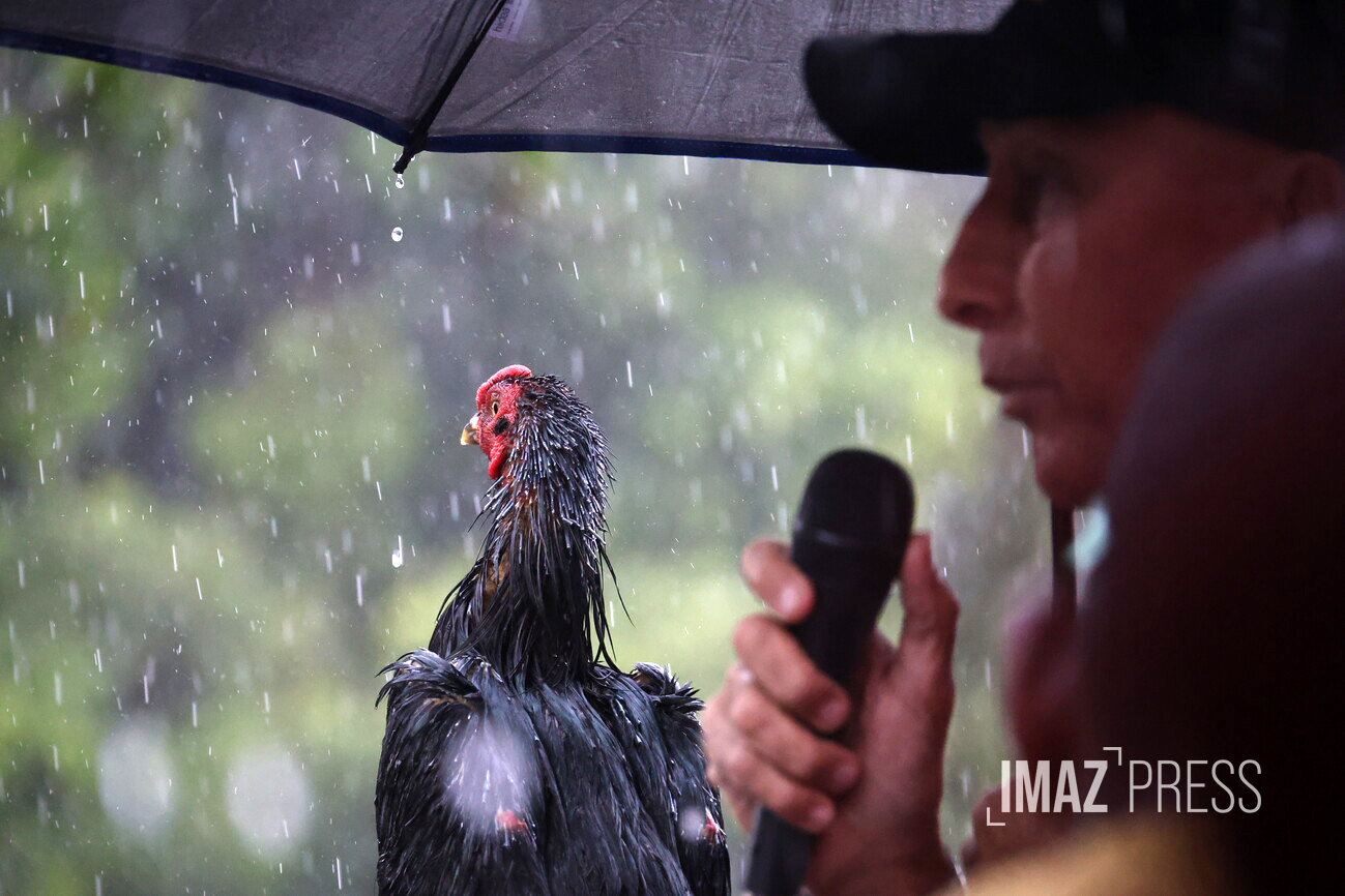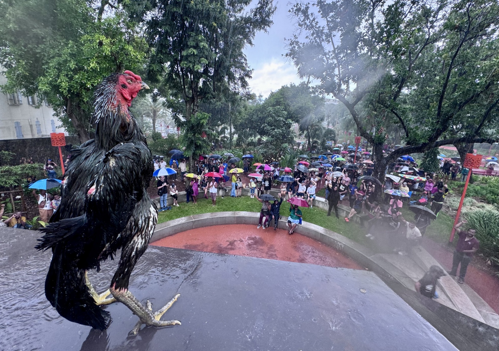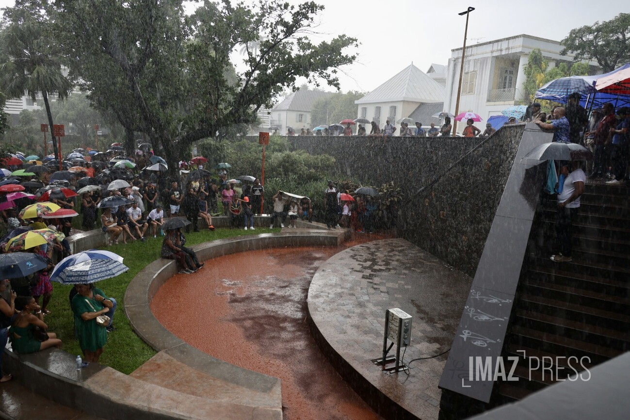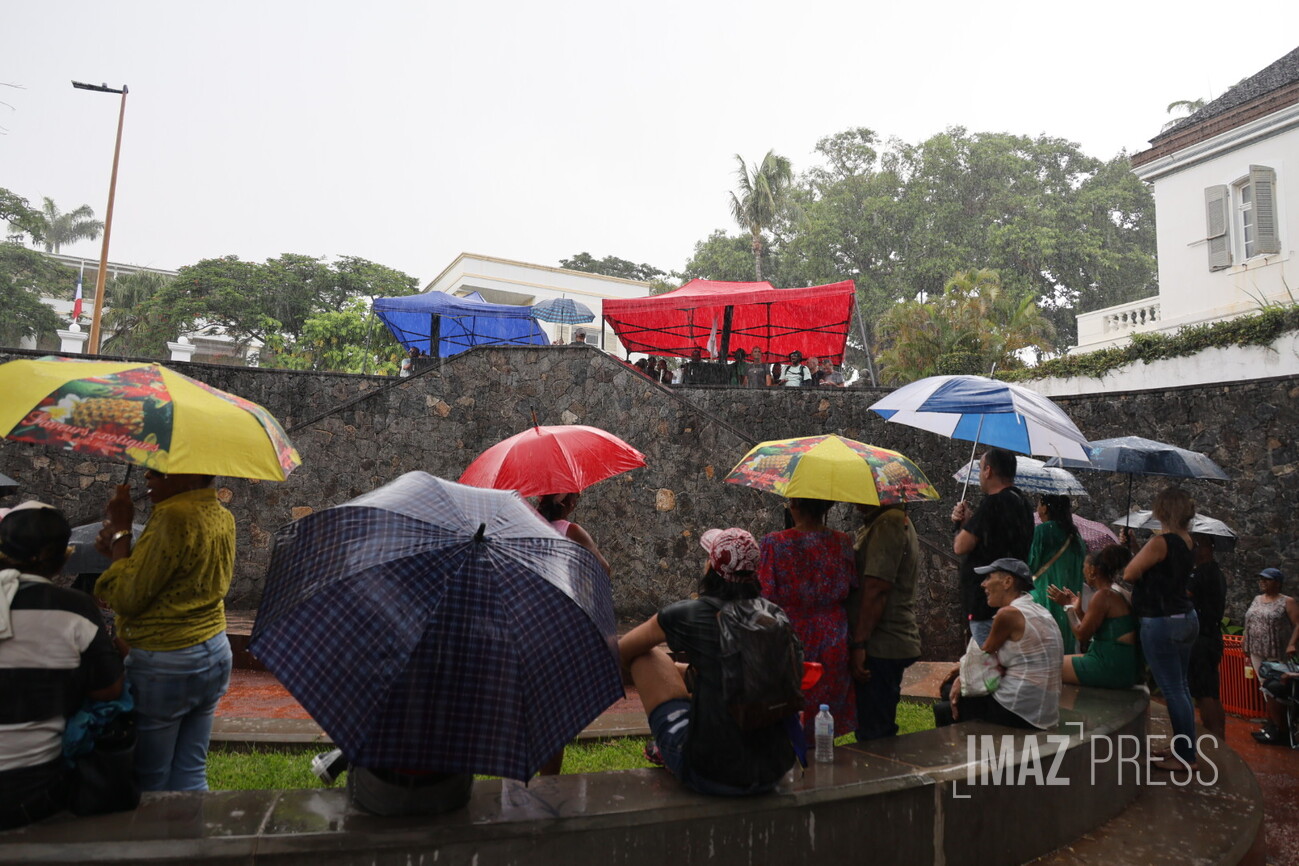 Alors que la pluie s'abat sur Saint-Denis, les discours sont difficilement audibles.