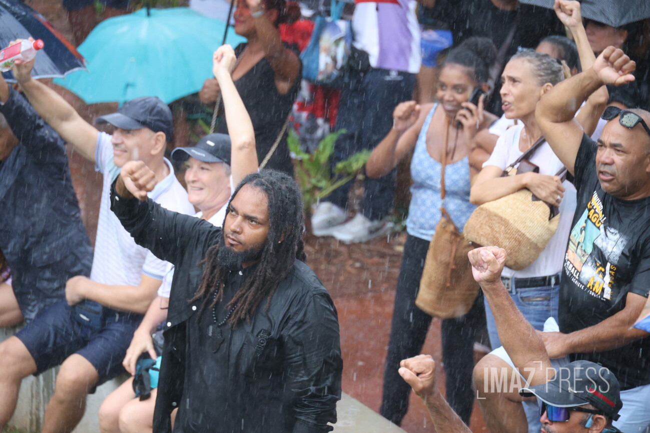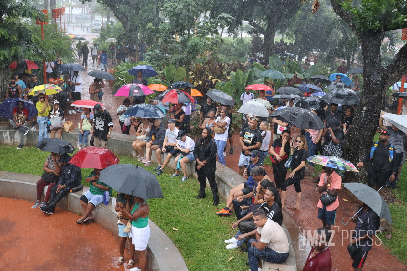 Environ 200 personnes ont répondu à l'appel de l'artiste King Tafari pour manifester ce samedi 8 février 2025 devant la préfecture. Si la revendication principale tourne autour de la délinquance, les organisateurs assurent aussi manifester contre la vie chère, les difficultés d'accès au logement et les injustices sociales. L'appel à manifester a été largement relayé sur les réseaux sociaux (Photo rb/www.imazpress.com)
