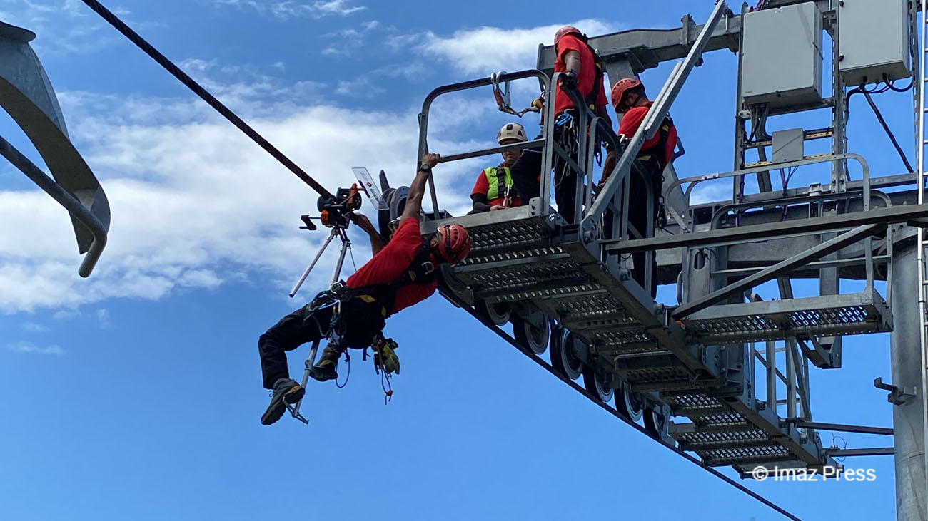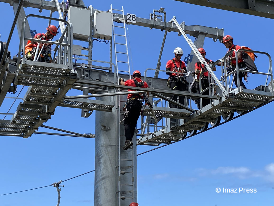 Le Papang s'est arrêté le temps d'un après-midi à Saint-Denis ce mercredi 26 octobre 2022. Non pas pour une panne ou un incident, mais pour permettre aux équipes de secours de se former pour l'évacuation de télécabines. Parmi eux le peloton de gendarmerie de haute montagne (PGHM) avec des membres du groupement d'intervention de la gendarmerie nationale (GIGN), des pompiers, et le Raid. Plus d'une trentaine de personnes était sur place pour cette formation. Une formation nécessaire pour pouvoir intervenir en cas d'incident. (Photo : ef/www.imazpress.com)