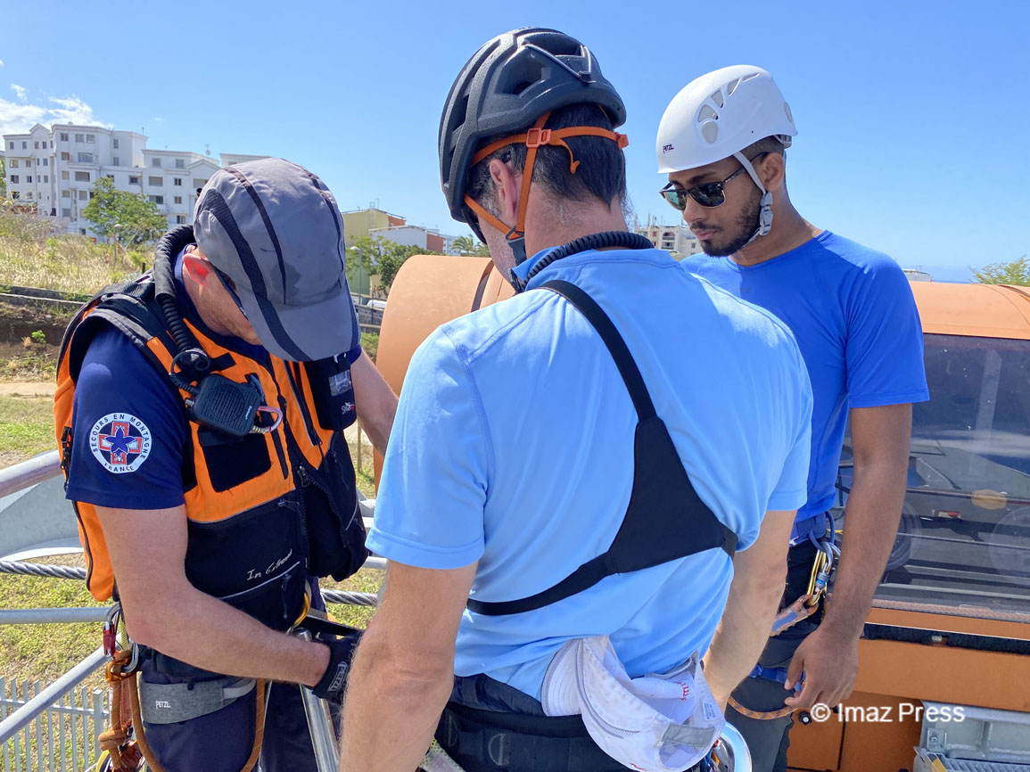 A station Moufia du téléphérique, 13 membres du PGHM et 4 du GIGN sont sur place pour s'entraîner. Comme l'explique Stéphane Narbaud, commandant du PGHM de La Réunion, "en condition réelle, il y aura un effectif moins important. Mais comme aujourd'hui c'est une journée dédiée aux entraînements, il faut que tout le personnel puisse se former cet après-midi".