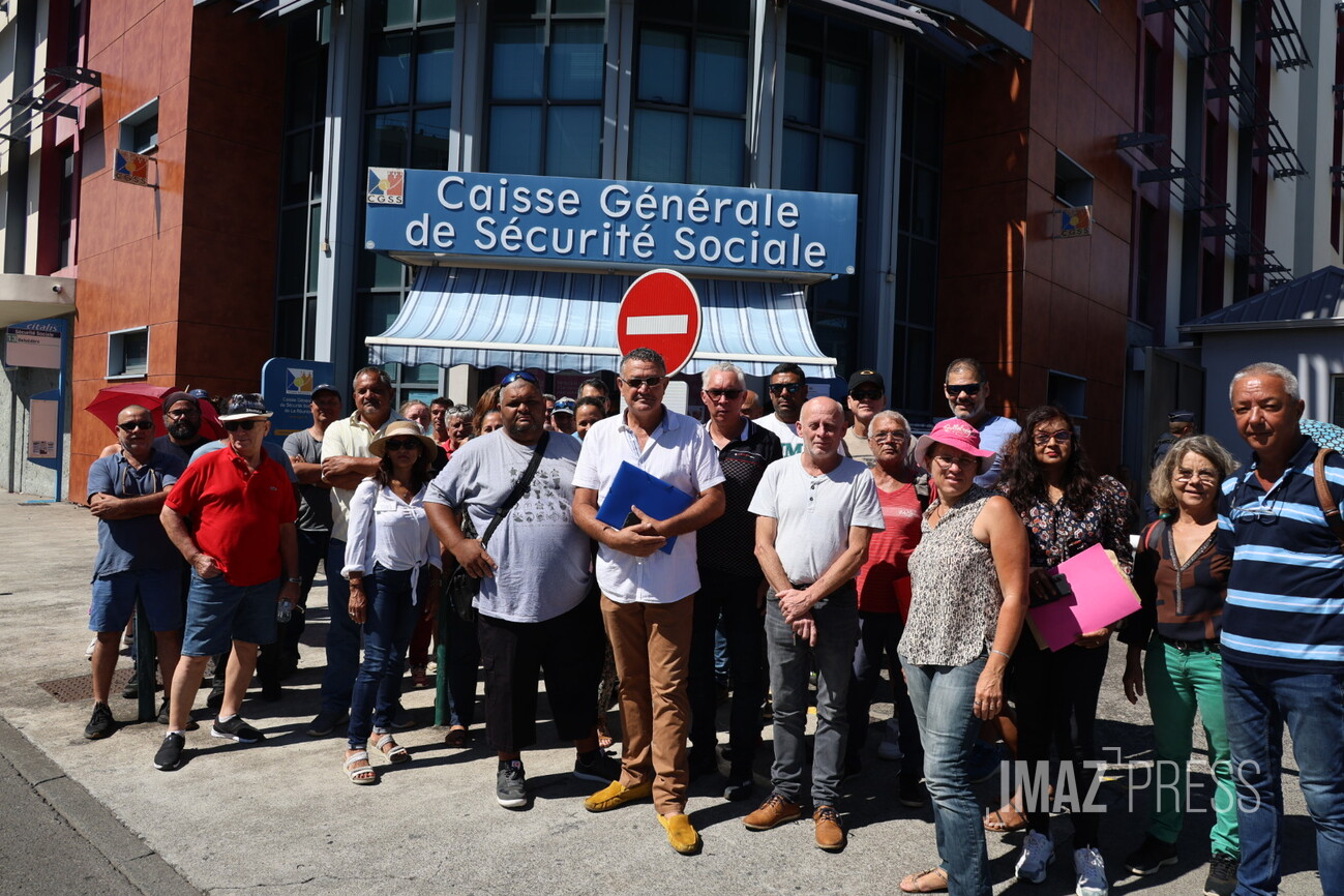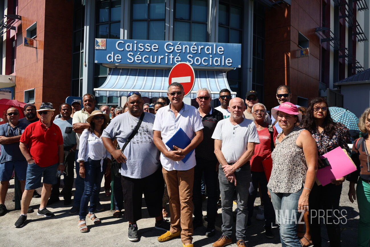 Le Collectif des syndicats et associations professionnels de La Réunion (CSAPR) manifeste ce jeudi 14 décembre 2023 devant la CGSS de Saint-Denis. Il réclame l'effacement des dettes des petites entreprises en difficulté, et l'arrêt des poursuites des créanciers (Photo sly/www.imazpress.com)