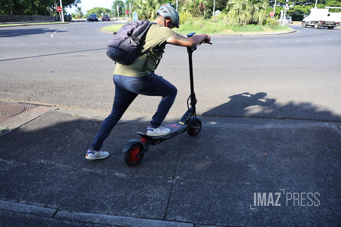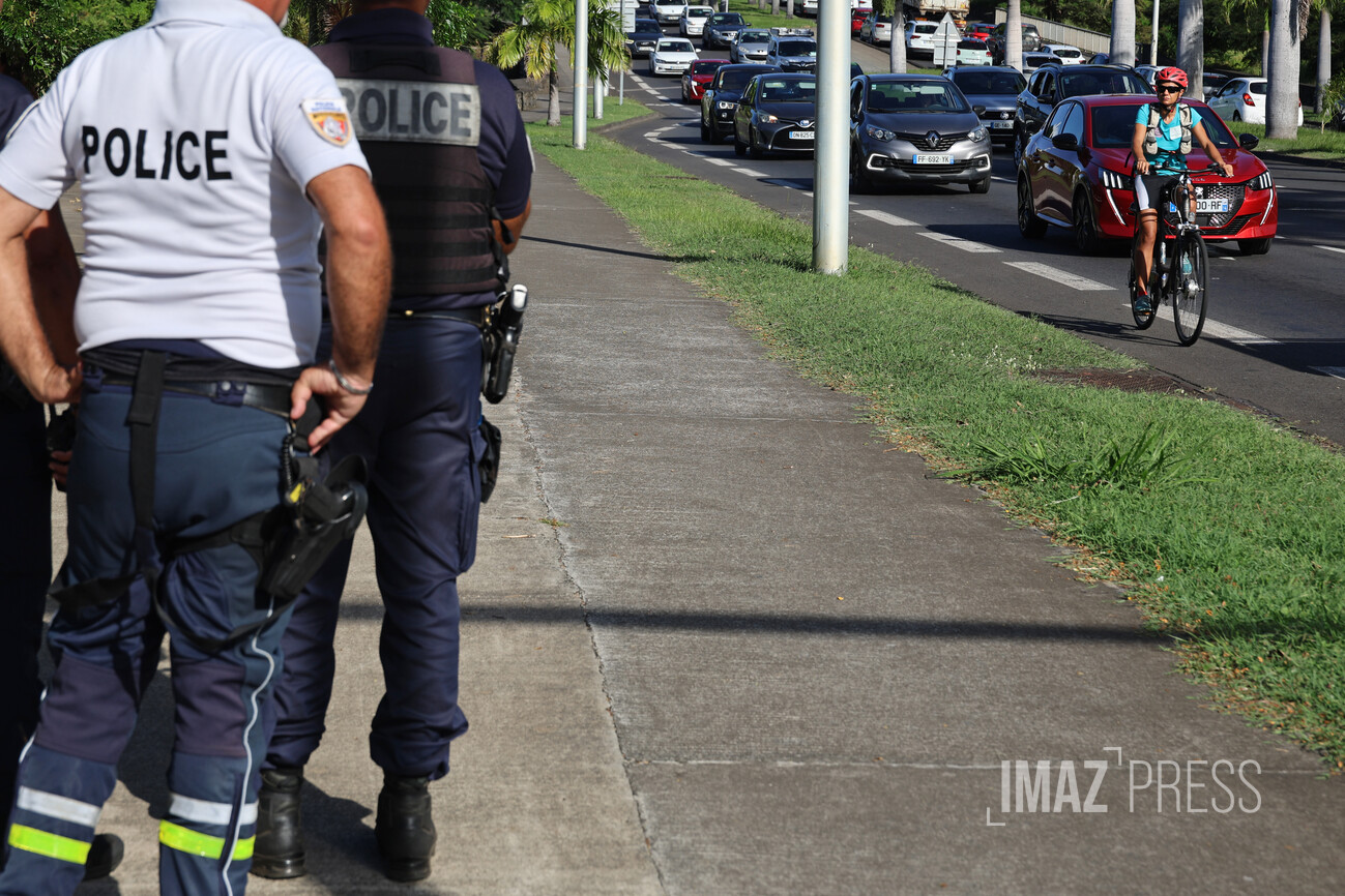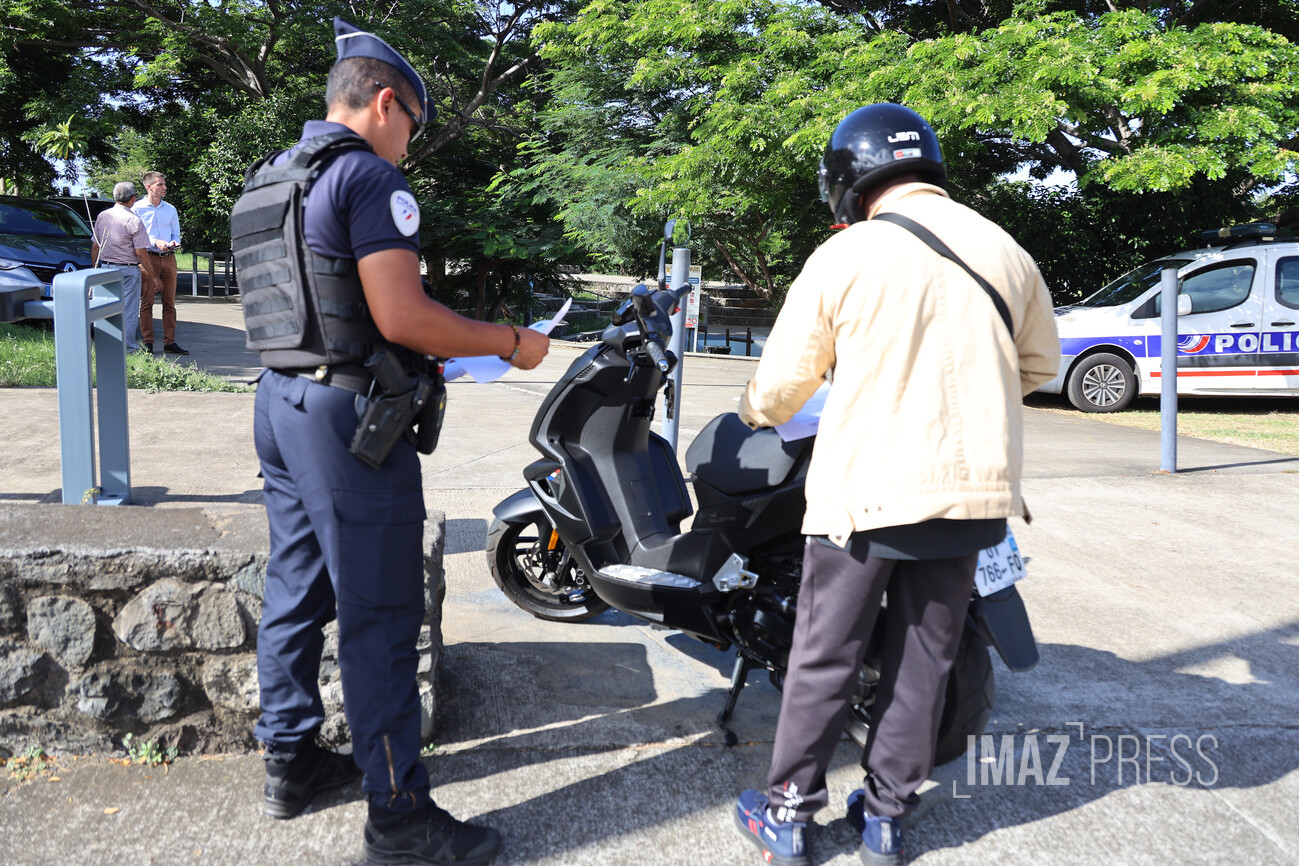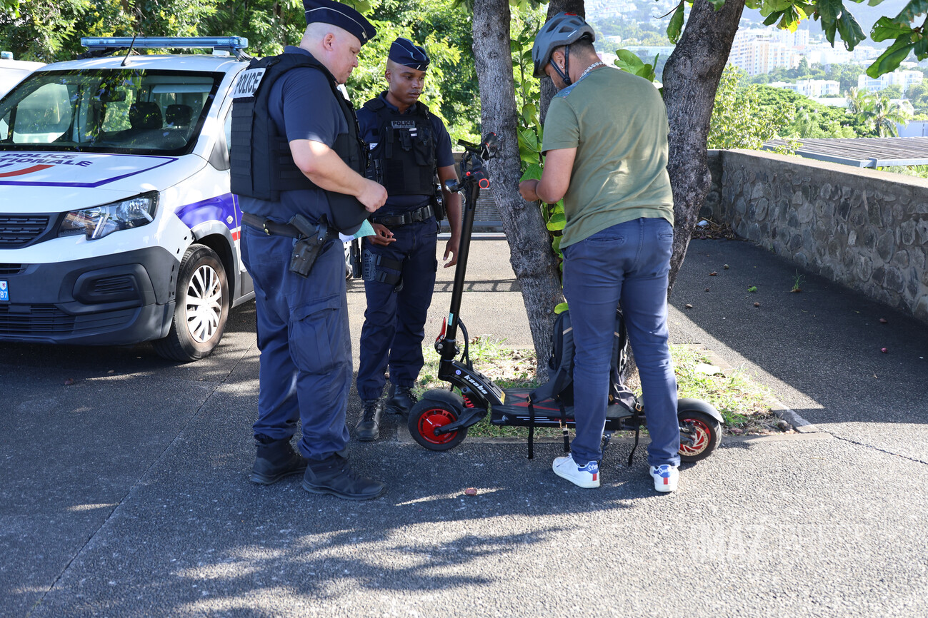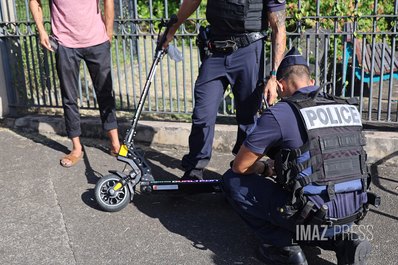 Les services de police de la préfecture ont mené ce jeudi 21 mars 2024 une opération de contrôle des usagers en engins de déplacement personnel motorisés (EDPM) aux abords du boulevard sud à Saint-Denis. C’est-à-dire les trottinettes électriques, les hoverboards ou encore les gyropodes. De plus en plus utilisés, la réglementation reste pourtant plutôt méconnue. (Photo Sly/www.imazpress.com)