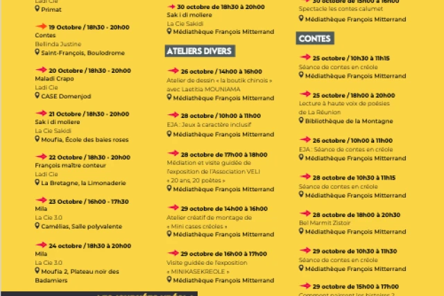Pendant douze jours, la culture créole va résonner dans le chef-lieu. De Saint-François à Sainte-Clotilde, en passant par Domenjod. Au programme : théâtre, contes, jeux lontan, atelier de cuisine créole, exposition ou encore animation musicale. « La nouveauté de cette année c’est le fait que les compagnies viennent directement présenter, jouer leur œuvre devant la population dans les quartiers. Ce qui change aussi c'est que l'on fait cet évènement sur douze jours au lieu de sept », lance Jean-Claude Lakia Soucalle, élu délégué à la culture dans les quartiers.