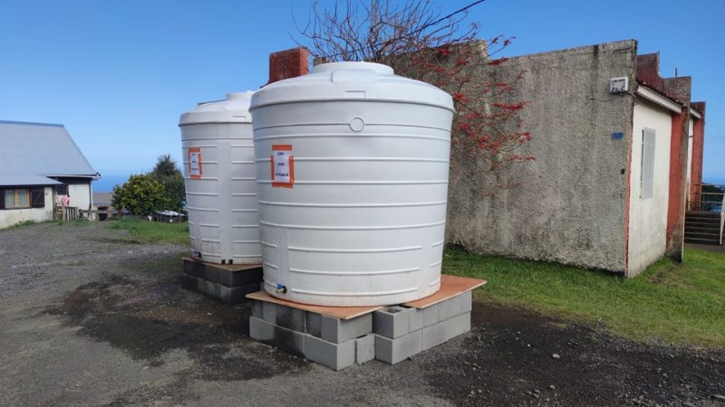 Cinq citernes d'eau ont été installées dans les secteurs privés d'eau sur la commune de Saint-Joseph, suite aux intempéries du week-end. Celles-ci sont localisées : chemin des Orties (partie haute), rue Claude Marion au niveau du terrain de foot (deux citernes), chemin Tamarin (au niveau de l'arrêt de bus) et enfin chemin Edouard Turpin (au début du chemin). Attention il s'agit d'eau non potable, destinée uniquement à l'usage domestique. (Photo : ville de Saint-Joseph)