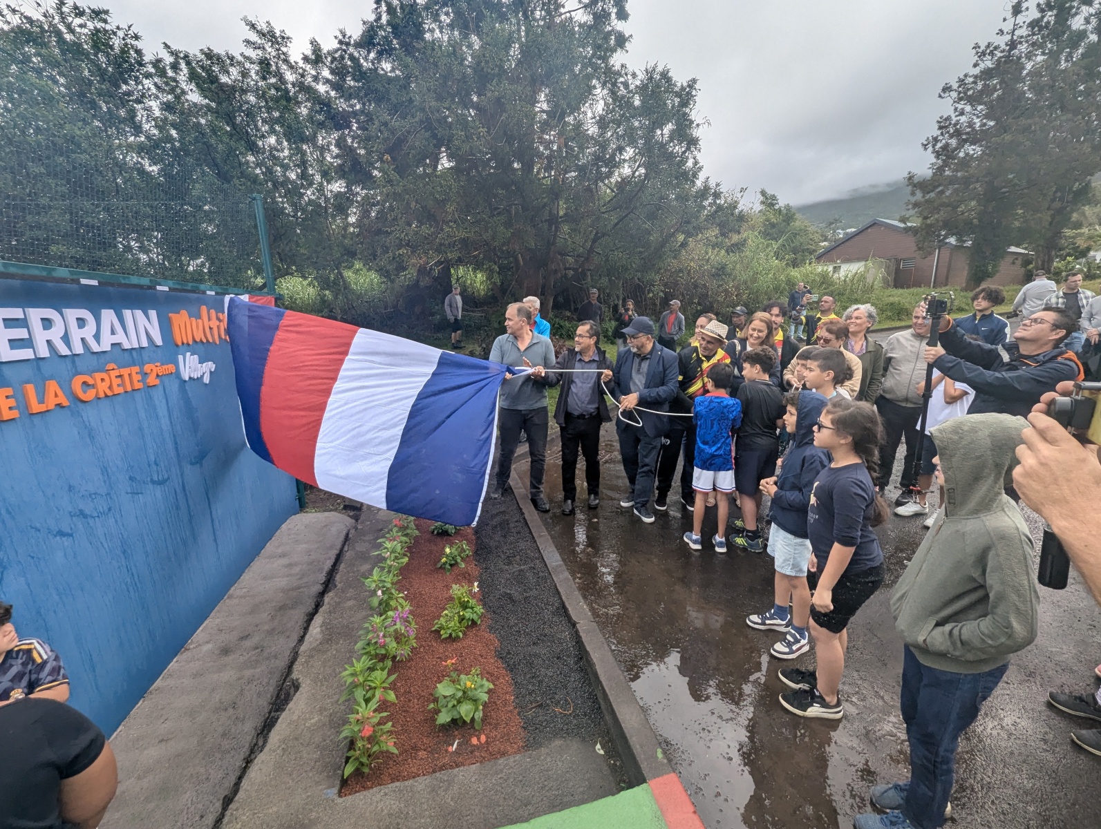 Ce mardi 1er juillet 2025, Patrick Lebreton, maire de Saint-Joseph a inauguré le terrain Multisports de la Crête 2ème Village, accompagné de Karine Sonn , de l'équipe éducative et des enfants de l'école du quartier (Photo ville de Saint-Joseph)
