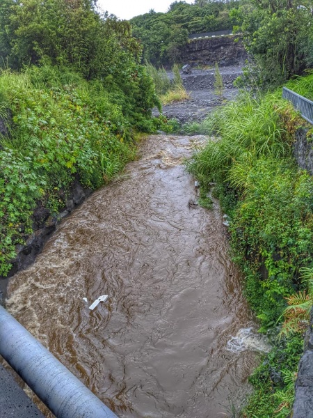 Le radier de la ravine Dominique à Saint-Joseph a été emporté. Une déviation est mise en place dans le sens montant par le chemin de la Chapelle et en sens descendant par la RD3 route Hubert-Delisle.