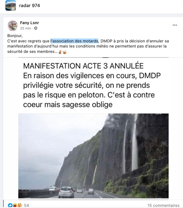 "C’est avec regret que l’association des motards, DMDP à pris la décision d’annuler sa manifestation d’aujourd’hui mais les conditions météo ne permettent pas d’assurer la sécurité de ses membres", informe l'association dans un message posté sur les réseaux sociaux.