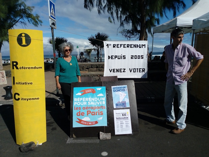 Une action a été organisée samedi 27 juillet 2019 au marché de Saint-Leu à propos du référendum des aéroports de Paris. 12 personnes étaient présentes de 9h à 12h sur deux points d'information sur le marché et 42 personnes ont pu voter directement en ligne sur le site du gouvernement. Une action similaire sera organisée le samedi 3 août au même endroit, selon les citoyens organisateurs, et elle sera répétée à nouveau dans les semaines à venir. Nous publions ci-dessous le communiqué du Collectif Réunion ADP.