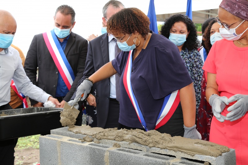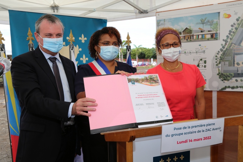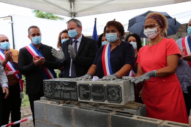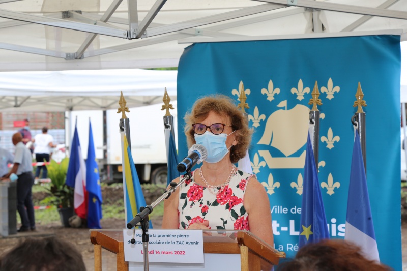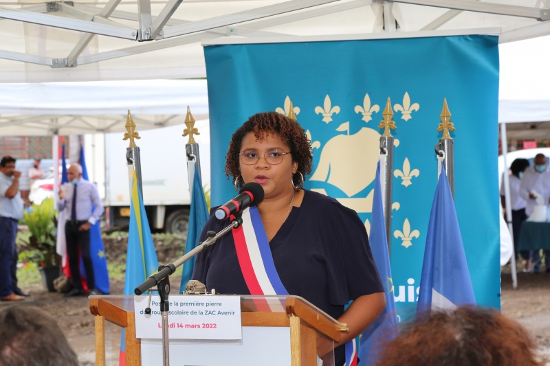 Juliana M’Doihoma, Maire de Saint-Louis a posé ce 14 mars 2022, la première pierre du futur groupe scolaire de la Zac Avenir, en présence de M. le Préfet, Jacques Billant; de Mme la Rectrice, Chantal Manès-Bonnisseau; de M. le Sous-préfet de Saint- Pierre, Lucien Giudicelli; de M. le Sous-préfet à la relance, Gilbert Manciet; de Mme la Vice-présidente de la Région, Lorraine Nativel; de M. l’Adjoint aux affaires scolaires, Sylvain Arthémise et de nombreux élus municipaux.